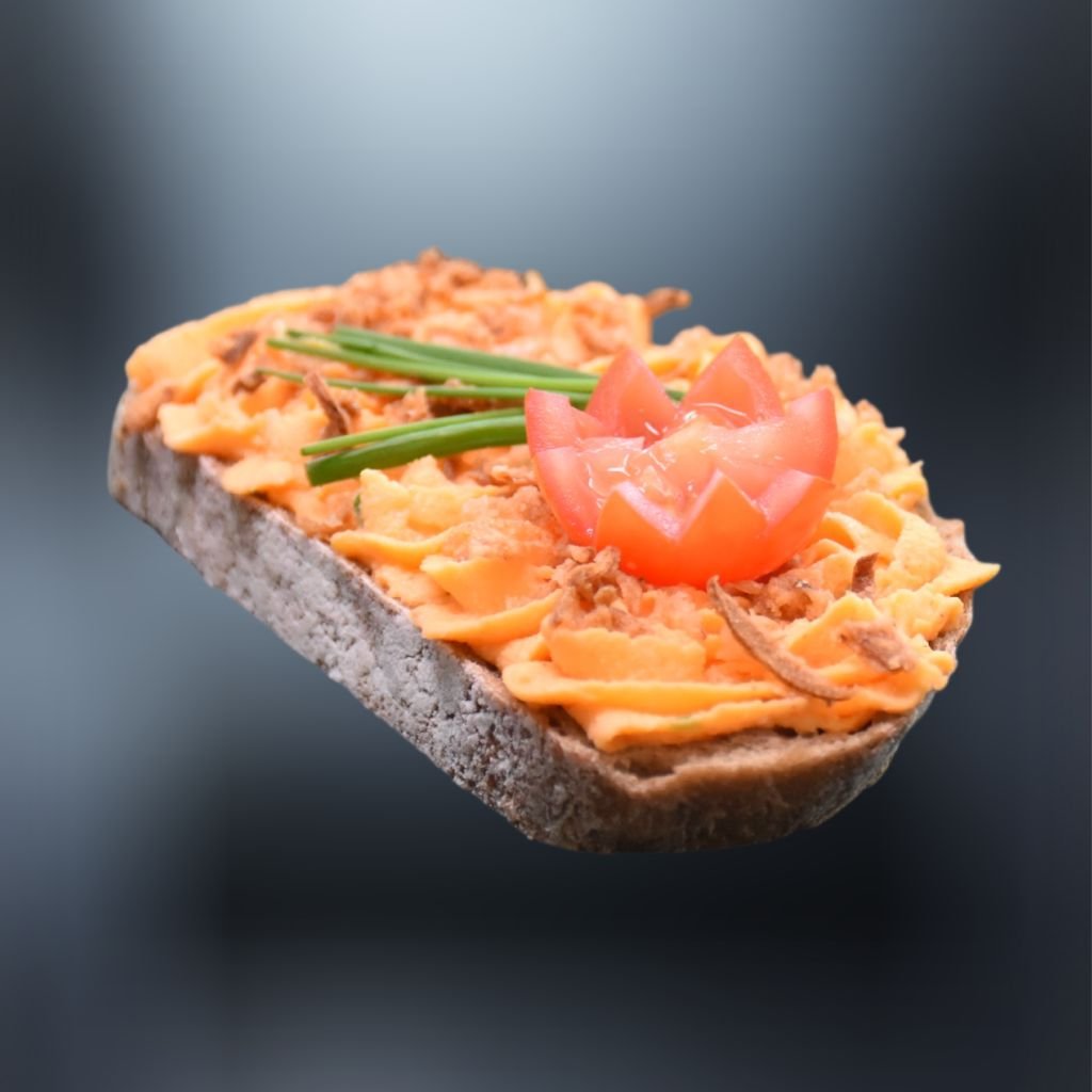 Na čerstvom chlebíku sa rozplýva lahodná bryndzová nátierka, doplnená sušenou cibuľkou a sezónnou zeleninou ( sviežim šalátom, pažítkou, cesnakovými výhonkami) vytvárajúc tak dokonalú harmóniu chutí. 🥖🧀🥗🌶️