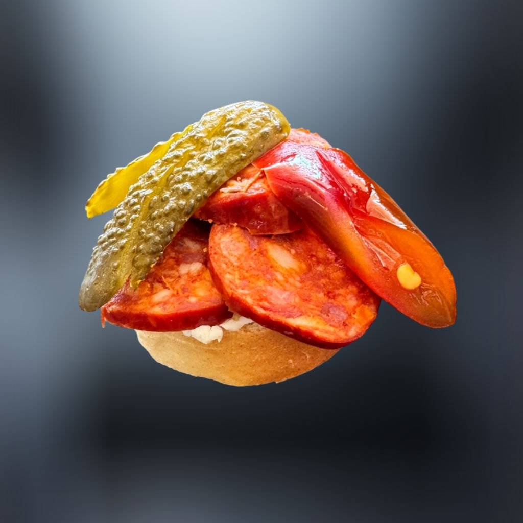 Na chrumkavej bagete sa vyníma lahodná nátierka, doplnená sviežou uhorkou, šťavnatou rajčinou, chrumkavým šalátom lollo alebo ľadovým a korunovaná údenou klobáskou. 🥖🧀🥗🍅🥒