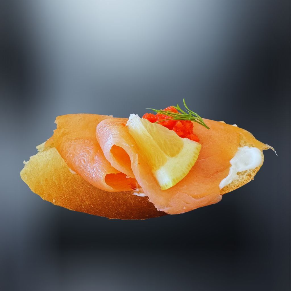 Na chrumkavej bagete sa vynímajú lahodné kúsky lososa, doplnené šťavnatým citrónom a voňavým kôprom čím je zvýraznená jedinečná chuť. 🥖🧀🥗🍅🥒