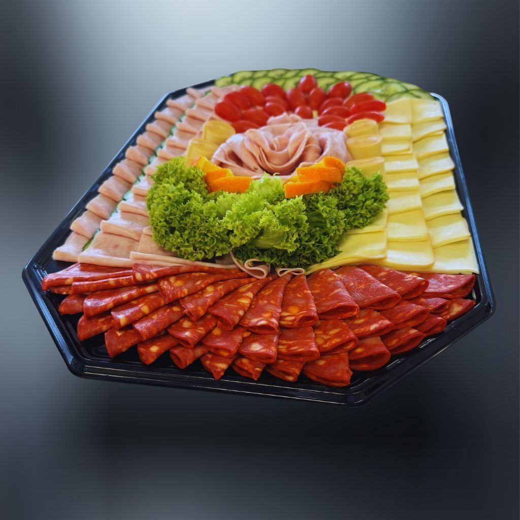 Bohatá obložená misa plná chutí – jemná šunka, korenené chorizo, osviežujúca uhorka, šťavnaté rajčiny, údené plátky syra Eidam, sladký pomaranč, svieži šalát Lollo a chutné pareničky, ktoré spolu vytvárajú dokonalú kombináciu pre každý stôl. 🥩🧀🍊🍅🥒🥗🍽️