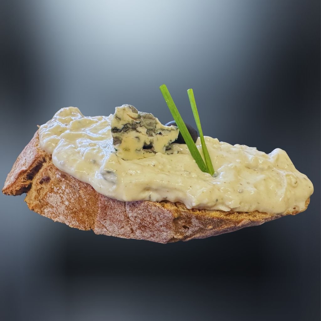 Na čerstvom chlebíku sa rozplýva lahodná nivová nátierka, doplnená čiernou olivou, šťavnatou pažítkou, vytvárajúc tak dokonalú harmóniu chutí. 🥖🧀🥗🌶️