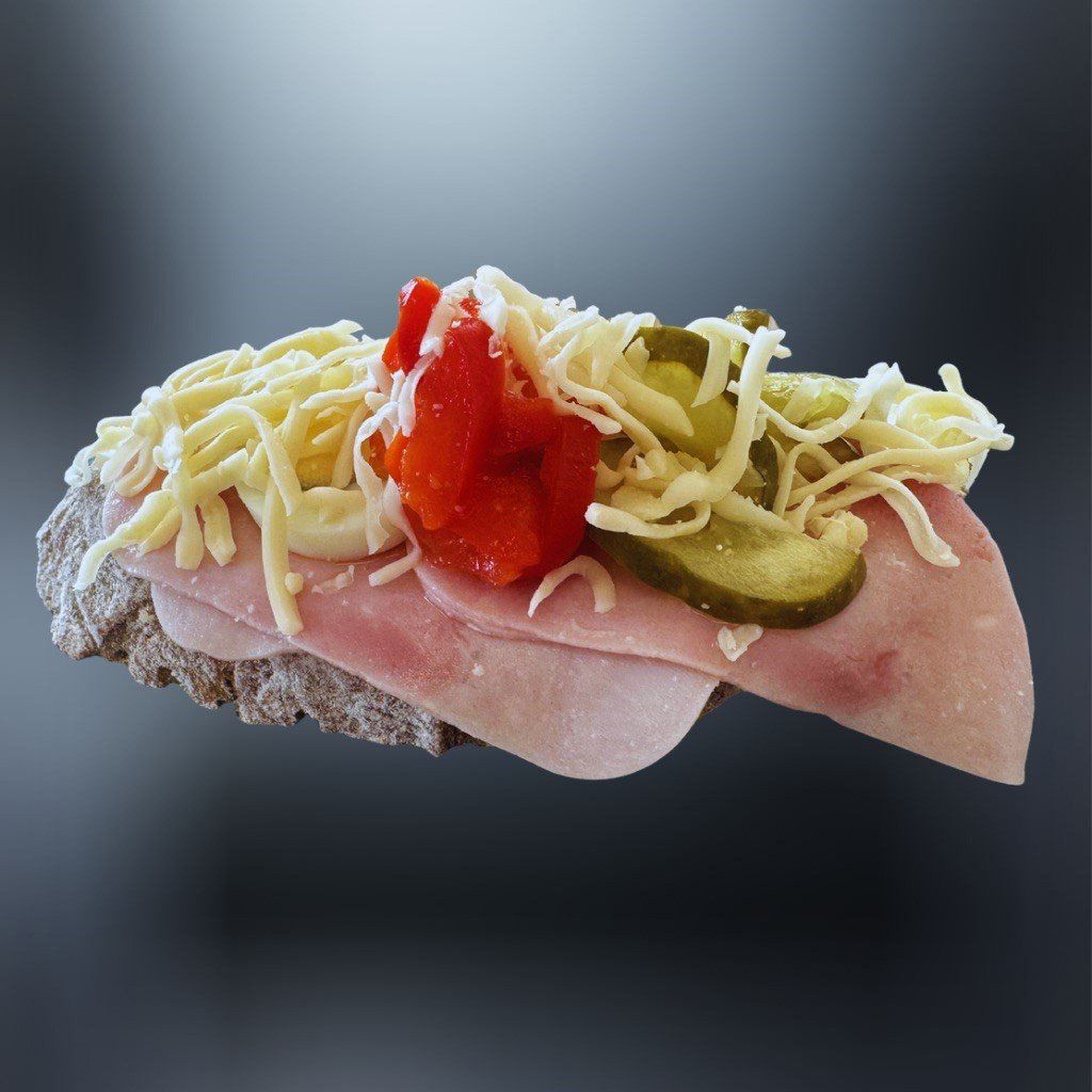 Na čerstvom chlebíku je základom lahodná bravčová šunka, doplnená stúhaným syrom Eidam a jemným parížskym šalátom, chlebík je osviežený šťavnatým šalátom, chrumkavou uhorkou, sladkou rajčinou a vareným vajíčkom s kápiou pre dokonalý chuťový zážitok. 🥖🧀🥗🍇🥒🍅🥚