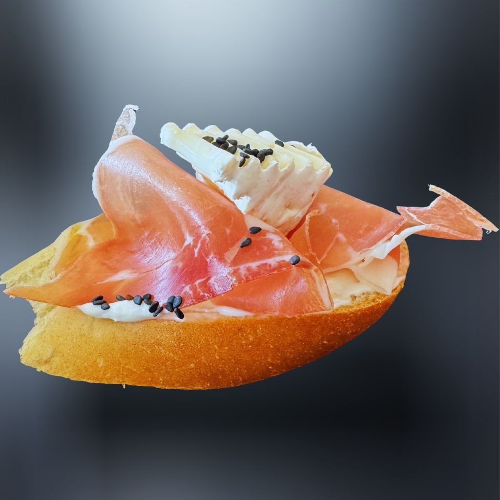 Na chrumkavej bagete je základom lahodná majonéza, doplnená vyzretým hermelínom a jemným prosciuttom pre dokonalý chuťový zážitok čiernym sezamom.