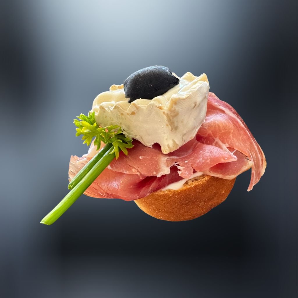 Na chrumkavej bagete je základom lahodná nátierka, doplnená vyzretým hermelínom a jemným prosciuttom pre dokonalý chuťový zážitok šťavnatou olivou, pažítkou a papričkou.