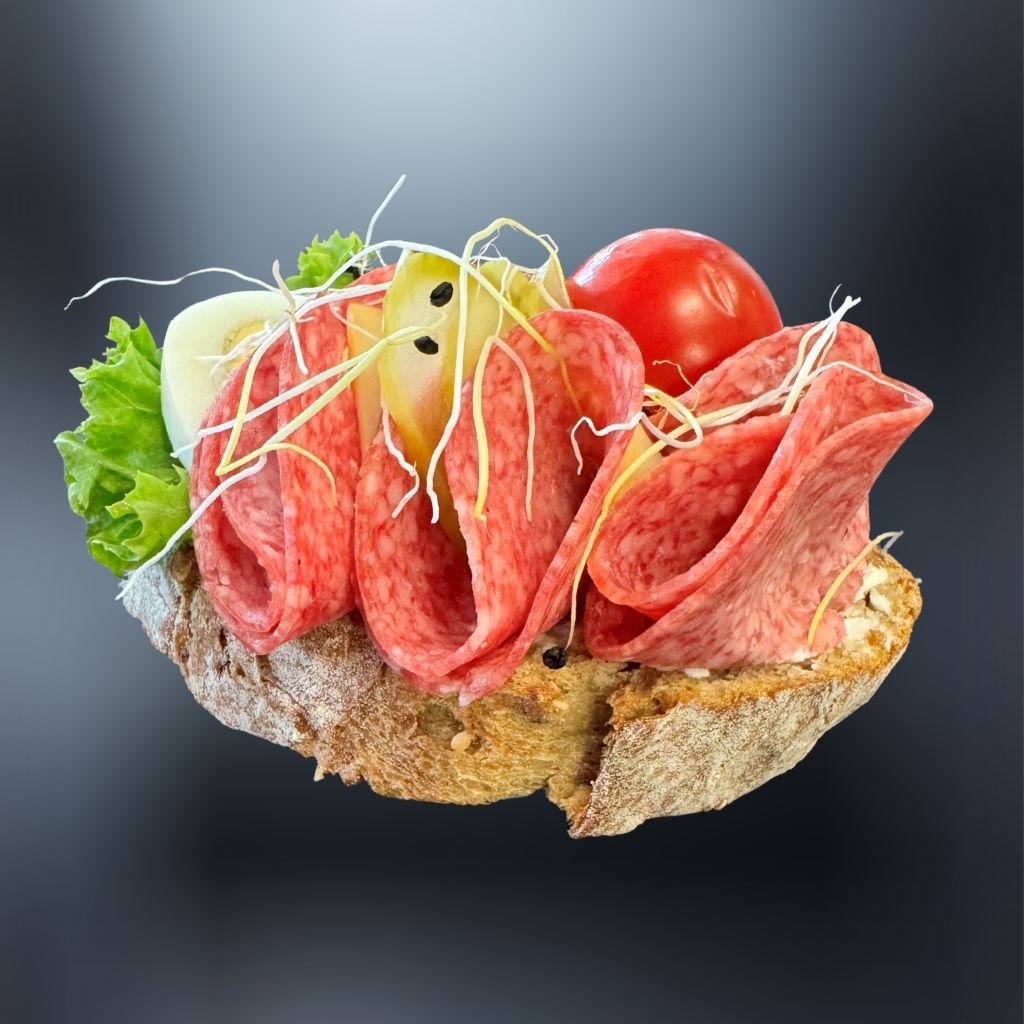 Na čerstvom chlebíku sa rozprestiera vrstva sviežeho šalátu (Lollo alebo ľadového), doplnená plátkami lahodnej salámy (Malokarpatská, Nitra, Paprikáš), vareným vajíčkom, šťavnatou rajčinou, chrumkavou uhorkou a jemnými klíčkami pre dokonalú harmóniu chutí. 🥖🥗🥚🌶️🍅