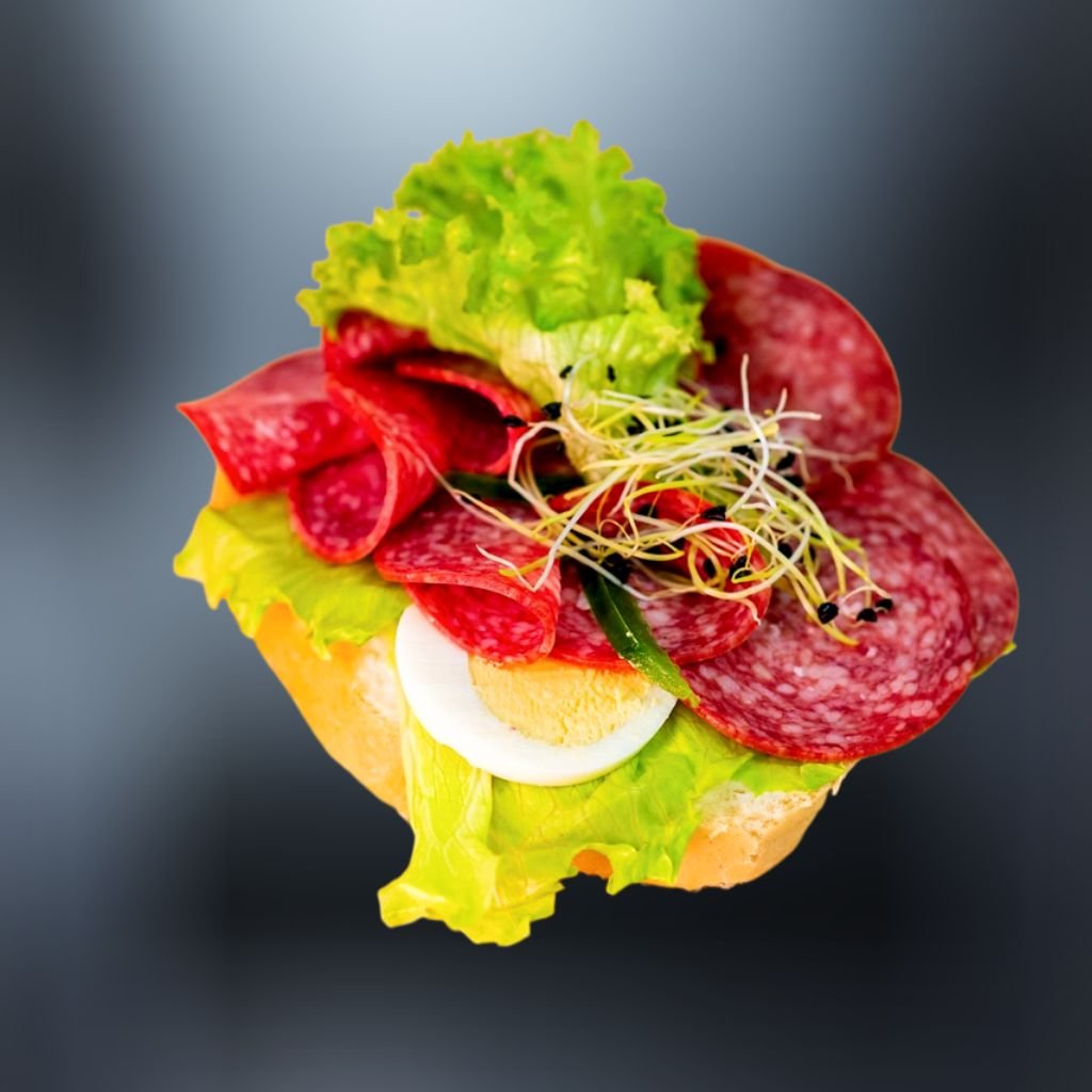 Na čerstvom chlebíku sa rozprestiera vrstva sviežeho šalátu (Lollo alebo ľadového), doplnená plátkami lahodnej salámy (Malokarpatská, Nitra, Paprikáš), vareným vajíčkom, šťavnatou rajčinou, chrumkavou uhorkou a jemnými klíčkami pre dokonalú harmóniu chutí. 🥖🥗🥚🌶️🍅