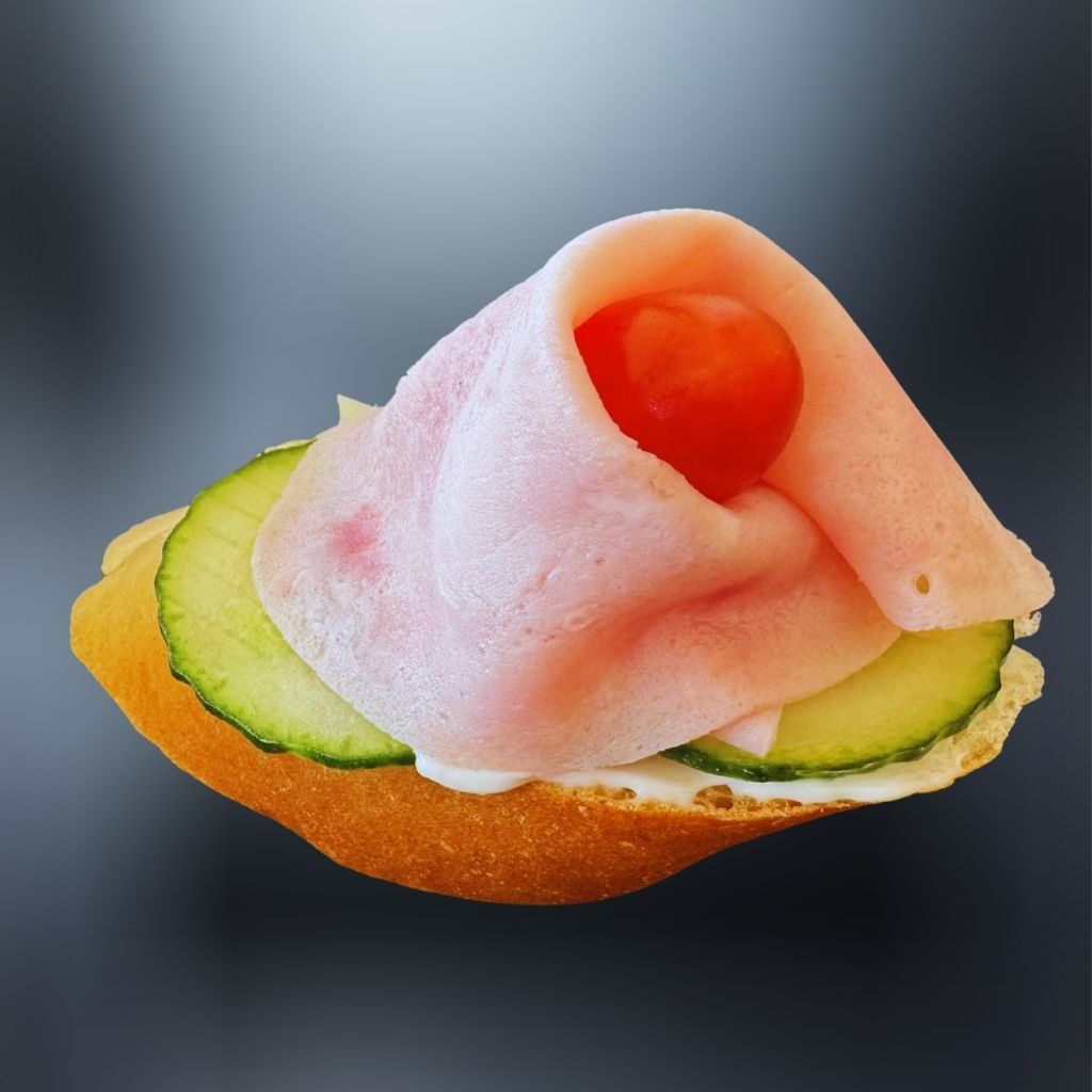Na chrumkavej bagete sa vyníma lahodná majonéza, jemná šunka, doplnená sviežou uhorkou, šťavnatou rajčinou a čerstvou uhorkou. 🥖🧀🥗🍅🥒