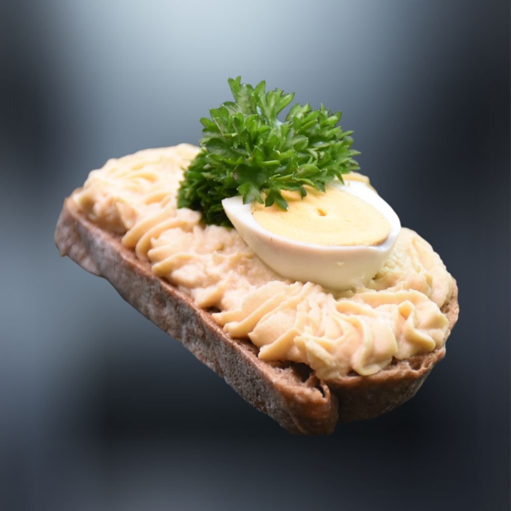 Na čerstvom chlebíku je základom lahodná vajíčková nátierka, doplnená uvareným plátkom vajíčka, chlebík je osviežený voňavou vňaťou. 🥖🥗🥚