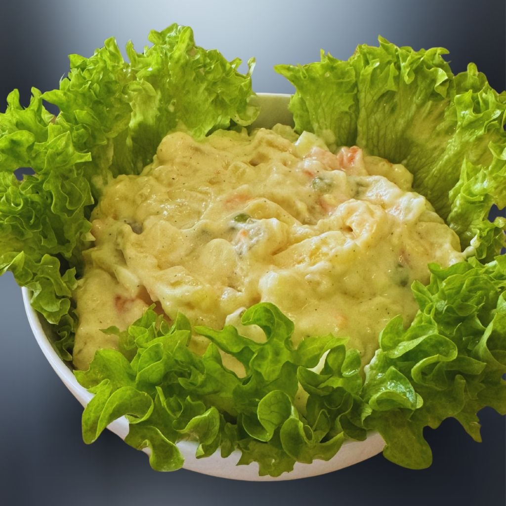 Zloženie: zemiaky, cibuľa, ocot, olej, soľ, korenie, majonéza, vajcia, mrkva, hrášok